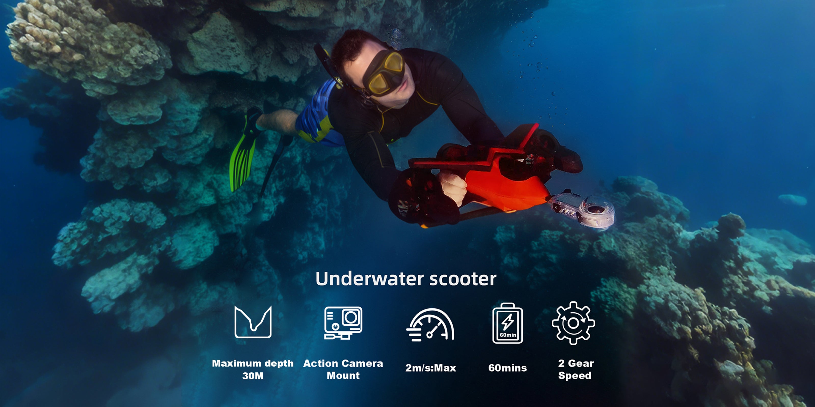 Dive up to 30m with DEDEPU's powerful scooter,featuring dual-speed control,2m/s max speed,a rechargeable battery lasting up to 60 minutes,and an action camera mount for epic underwater adventures.